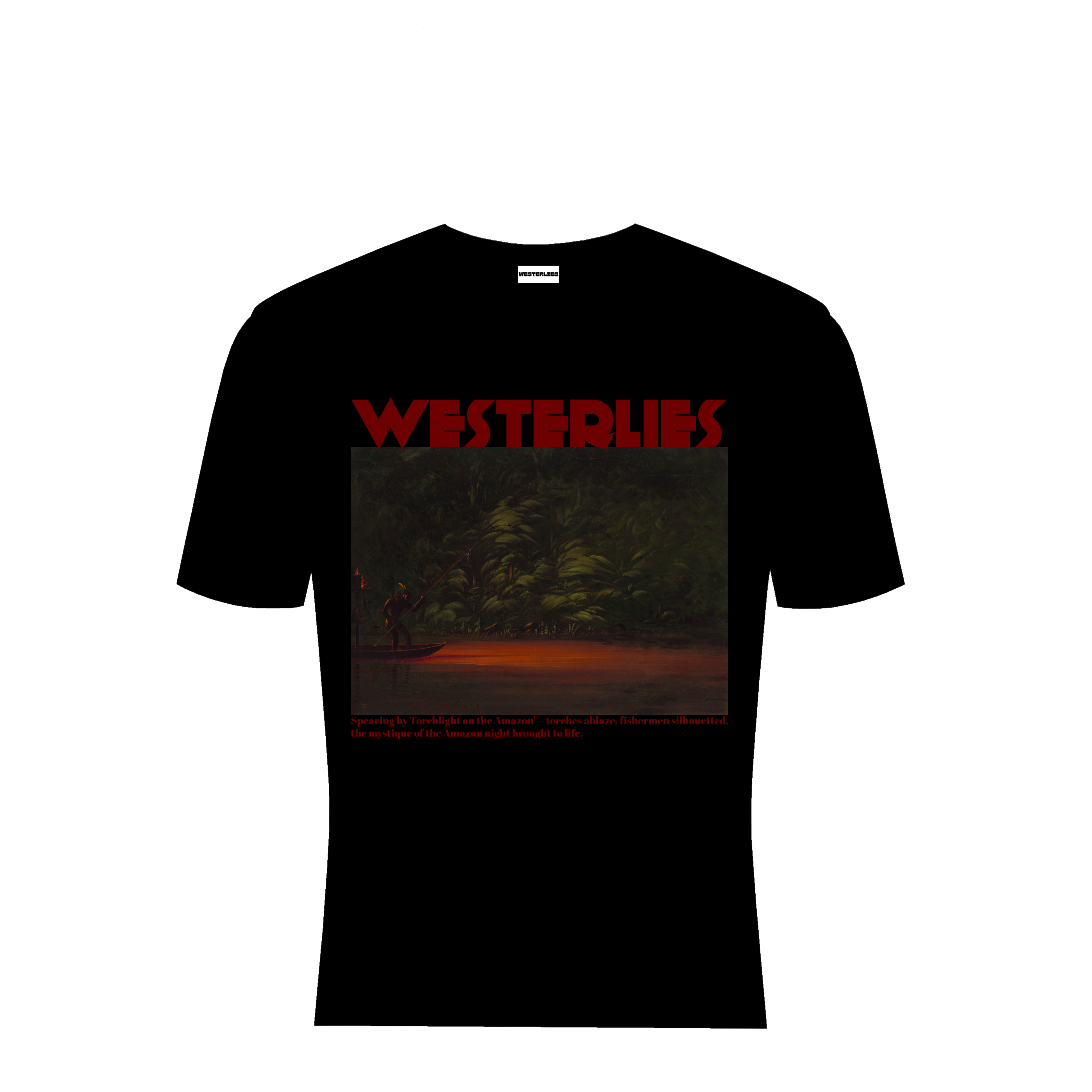 At Westerlies, our goal is to create clothing that resonates with the stories and emotions of iconic art. This tee is more than a fashion statement; it is an homage to the enduring traditions and the awe-inspiring beauty of the natural world. By featuring “Spearing by Torchlight on the Amazon” in our collection, we aim to celebrate the spirit of adventure and the timeless bond between humanity and nature. This design exemplifies our commitment to blending historical influences with contemporary style, offering pieces that are both meaningful and visually striking.